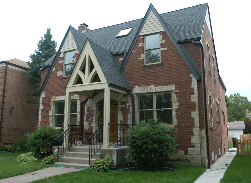 This 2-story Tudor was added onto with a more dramatic roof line and quite cozy entrance canopy.