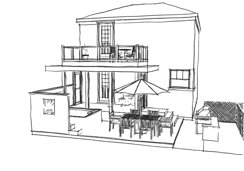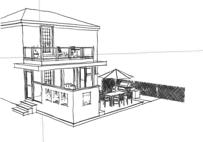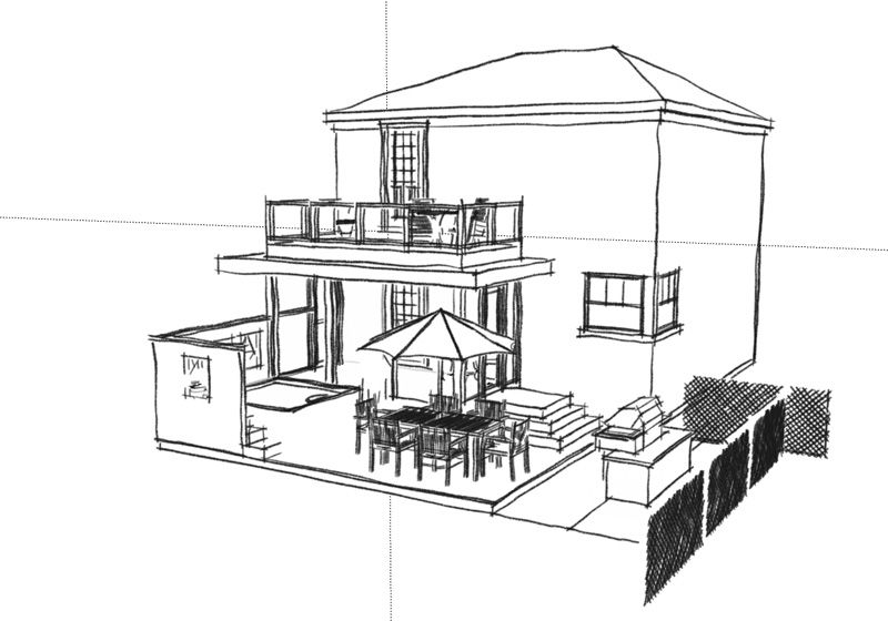 The existing home had no area designated for outdoor use. Created here was an exterior environment able to be used by many. The unobtrusive screened porch evolved into the creation of a balcony for use off the Master Bedroom. Privacy and a BBQ area were also incorporated into the program.